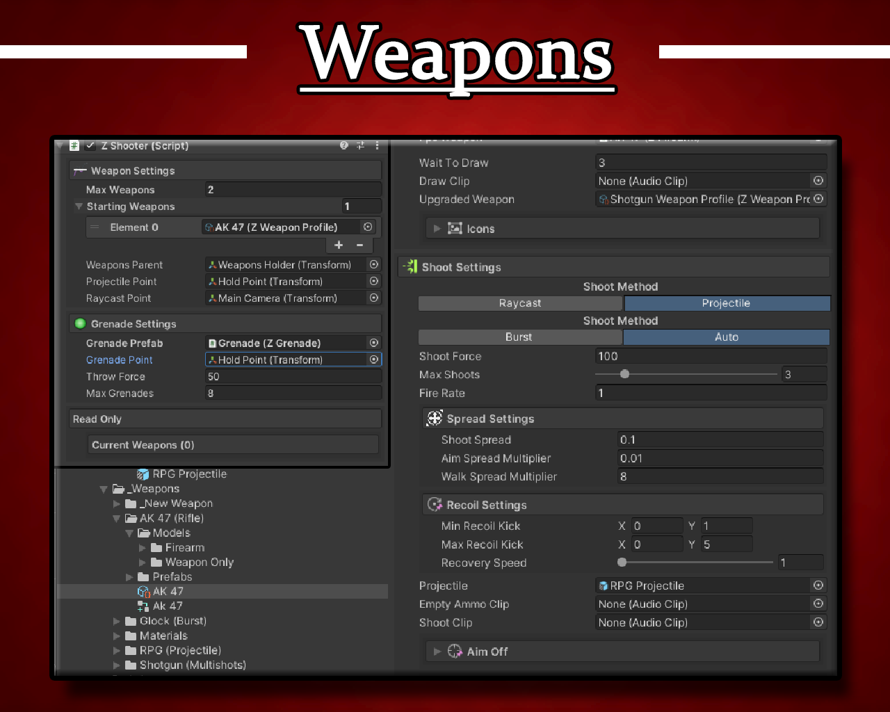 💡 Some weapon profiles are already prepared for you — just grab the gun, set the animator, and you’re good to go.